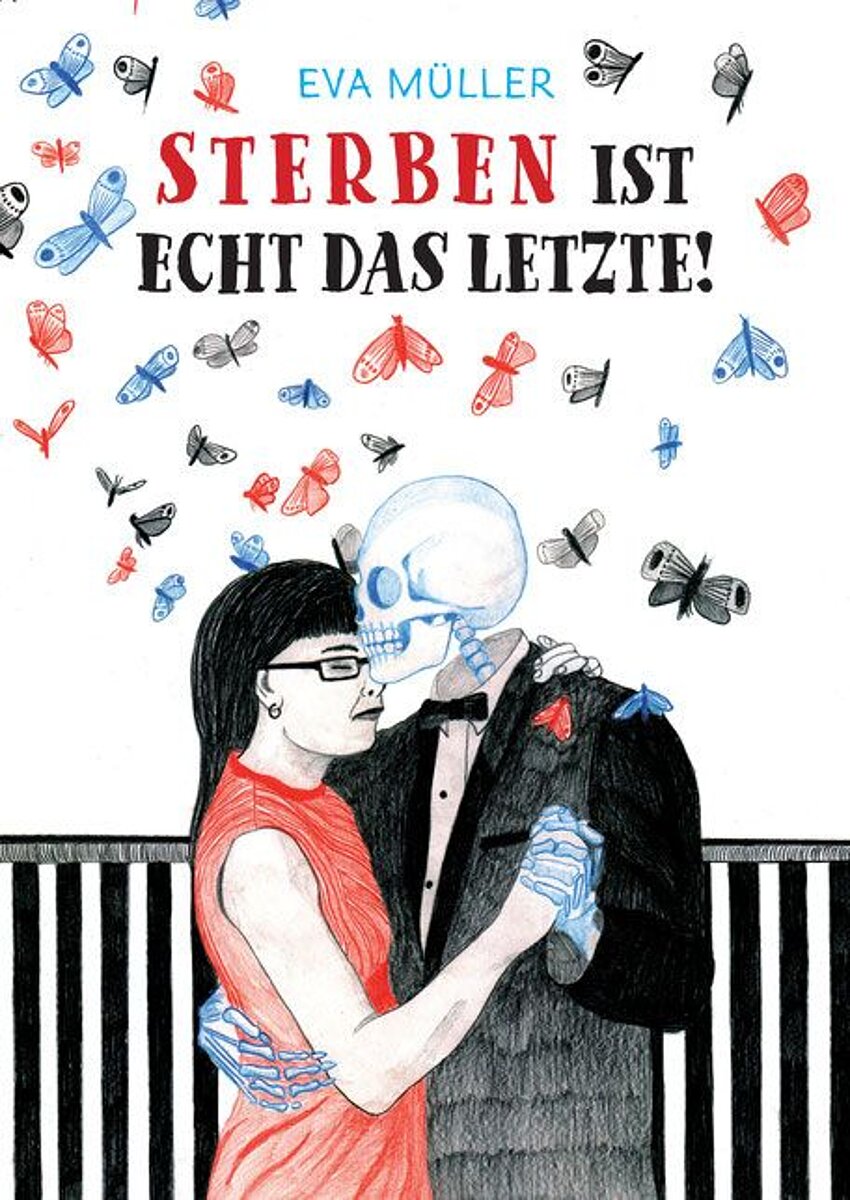 Ist die Angst vor dem Tod ein Teil des Menschen? Kann sein. Sicher aber ist, die Angst vor dem Tod ist Eva Müller. Und die ist noch nicht mal 40 Jahre alt. Auf dem Cover ihres Buches „Sterben ist echt das Letzte“ tanzt sie innig verbunden mit dem Skelett im Anzug, mit dem personifizierten Tod. Es scheint, als wäre dies eine ausgewogene Beziehung. Erst auf den zweiten Blick sieht man, dass das Paar nicht von Schmetterlingen, sondern von Motten umschwirrt ist. Das scheinbar bunte Bild offenbart seine Düsternis.